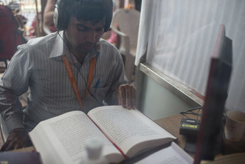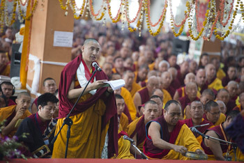 The Hindi language translator working during the last day of His Holiness the Dalai Lama's teachings at Ganden Jangtse Monastery in Mundgod, Karnatak, India on December 28, 2014. Photo/Tenzin Choejor/OHHDL