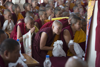 At Jangchub Choeling Nunnery he commended the nuns for their studies, recalling an occasion when they visited Dharamsala and the public consensus was that they had debated the most effectively. He recalled that nuns had really begun to study seriously in the late 80s and now there were candidates in the process of taking their Geshema degrees. He said studying philosophy broadens your view and is an effective way of achieving equality. He reiterated that the Buddha had given equal opportunity to both men and women and encouraged the nuns to take advantage of it.