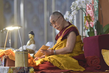 As a concise way of generating bodhichitta, His Holiness said he would like to recite with all those present who wished to do so, the common verse that combines taking refuge and generating the awakening mind.
