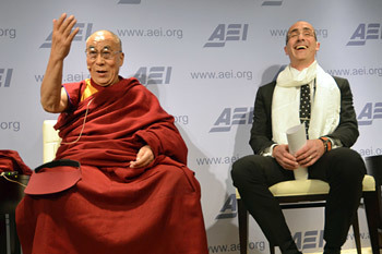 His Holiness the Dalai Lama and AEI President Arthur Brooks during their discussion on "Happiness, Free Enterprise and Human Flourishing" at the American Enterprise Institute in Washington DC on February 19, 2014. Photo/Patrick G. Ryan