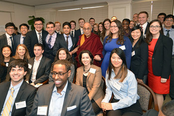 His Holiness the Dalai Lama with students and potential future leaders after their meeting at the American Enterprise Institute in Washington DC on February 19, 2014. Photo/Patrick G. Ryan