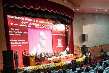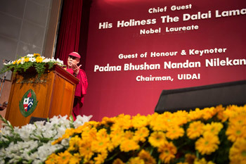 His Holiness the Dalai Lama speaking at the Association of Heads of Anglo-Indian Schools in India's 92nd Annual Conference at Bishop Cotton School in Bangalore, India on January 5, 2014. Photo/Tenzin Choejor/OHHDL
