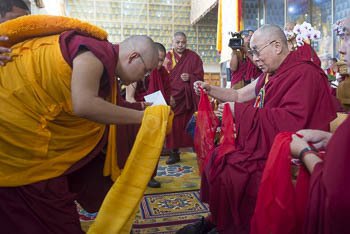 | Ling Rinpoche paying his respects at the welcoming ceremony on His Holiness the Dalai Lama arrival in Ganden Jangtse Monastery in Mundgod, Karnataka, India on December 22, 2014. Photo/Tenzin Choejor/OHHDL |