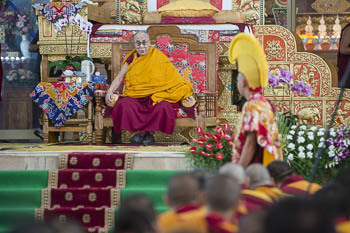 “Tri Rinpoche, Abbots and former Abbots and everyone gathered here, my greetings to you all. Thank you for receiving me here today. Since I’ll have a lot to talk about from tomorrow, I don’t have much to say today. I’ve been a little busy. In Rome I felt a bit tired because the days’ programmes were quite long. After that there were teachings for Russians attended by 1400 in Delhi. The Russian students are sincere, and were enthusiastic about coming, despite many of them not being very well off at the moment.”