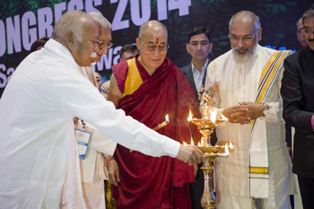 His Holiness the Dalai Lama and fellow guests light a lamp to inaugurate The 1st World Hindu Congress in New Delhi, India on November 21, 2014. Photo/Tenzin Choejor/OHHDL