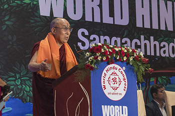 His Holiness the Dalai Lama delivering the inaugural address at the 1st World Hindu Congress in New Delhi, India on November 21, 2014. Photo/Tenzin Choejor/OHHDL