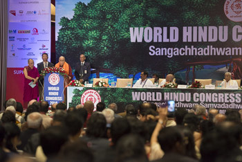 In his message to the Congress Swami Dayanand Sarasvati said he was happy to know that Hindu leaders were gathering at a time when favourable change is taking place in the Hindu world. Ashok Singhal gave a rousing speech in Hindi about the focus of the VHP being on the emergence of an invincible Hindu, a fearless Hindu. A new publication entitled Prabodhan was released. C.V. Wigneswaran, Chief Minister of Sri Lanka's Northern Province, informed the gathering of the experiences of Hindus in that country. Dr Mohanrao Bhagwat spoke of whether it was an opportune time for Hindu resurgence. He acknowledged His Holiness the Dalai Lama’s remarks about the sameness of all human beings and defined a Hindu as a human being who sees unity in every diversity. What Hindus have to contribute, he said, is their values.