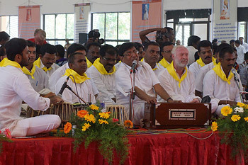 An estimated 5000 people, adults and children attired in orange in the manner or Swami Vivekananda, were present in a hall at the Codissa Trade Fair Centre when Swami Satyanand Maharaj escorted His Holiness to the dais. To begin with a group of singers and musicians led singing of joyful bhajans as His Holiness looked on, smiling. Next was the auspicious lighting of the lamp, followed by introductory speeches, notably the keynote address by Sri Swami Nirmalandantha. Then came one of the highlights of the event as His Holiness was invited to unveil a 7 feet 9 inch tall Makrana Marble statue of Vivekananda that was actually at Vattamalai near Kangeyam about 70 km away. This was achieved by inviting him to press a button that triggered the parting of curtains before the image, which was viewed by everyone in the hall on large video displays. Immediately afterwards, His Holiness was invited to speak.