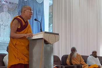 His Holiness the Dalai Lama speaking during celebrations of the 150th anniversary of the birth of Swami Vivekananda in Coimbatore, Tamil Nadu, India on January 7, 2014. Photo/Jeremy Russell/OHHDL