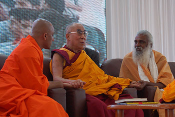 Swami Nirmaladantha, His Holiness the Dalai Lama and Swami Satyanand Maharaj on stage together during celebrations of the 150th anniversary of the birth of Swami Vivekananda in Coimbatore, Tamil Nadu, India on January 7, 2014. Photo/Jeremy Russell/OHHDL