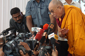 His Holiness the Dalai Lama interacting with members of the media after his address at celebrations of the 150th anniversary of the birth of Swami Vivekananda in Coimbatore, Tamil Nadu, India on January 7, 2014. Photo/Jeremy Russell/OHHDL