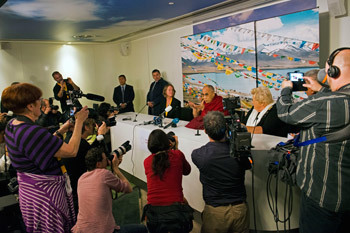 His Holiness told the assembled journalists how happy he was to be in Holland again, the land of fine people and beautiful tulips. He gave a summary account of his three commitments, telling them of his efforts to promote human values based on love and affection, his interest in fostering inter-religious harmony and in preserving Tibet’s culture of peace and compassion, as well as the delicate environment of the Roof of the World