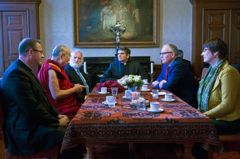 | His Holiness the Dalai Lama, Rabbi Awraham Soetendorp, Assistant Bishop of Utrecht Monseigneur Herman Woorts, Foreign Minister of The Netherlands Frans Timmermans, and representitive of the Protestant Church in The Netherlands Karin van den Broeke meeting at the church of Jacobuskerk in The Hague, Holland on May 10, 2014. Photo/Jurjen Donkers |