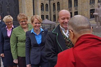 Oslo, Norway, 9 May 2014 - His Holiness the Dalai Lama was met on the steps of The Storting, the Norwegian Parliament building by Ketil Kjenseth, Liv Signe Navarsete and other Members of Norwegian Parliamentary Group for Tibet, who escorted him into the building. Ketil Kjenseth explained that he was dressed in the local costume of his constituency, Oppland, to mark the fact that it was the first place in Norway to welcome and accommodate Tibetan refugees. After Members of Parliament, including members of the governing coalition, representatives and youth representatives of all other political parties, had introduced themselves, His Holiness was invited to speak.