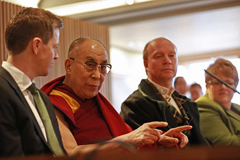 At the Nobel Peace Centre, His Holiness was welcomed by the director, Bente Erichsen, who showed him around. Among other things she showed him the Fred and Toca Loca children's display about Nobel Peace Prize winners that features him as one of the five best loved Nobel laureates. In a recorded conversation that will be played in schools, His Holiness spoke to a group of high school students about the value of affection and inner peace in creating a happier world. The Mayor of Oslo, Fabian Stang, took the opportunity to introduce himself to His Holiness.