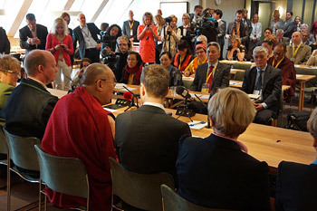 | His Holiness the Dalai Lama speaking to members of the Norwegian Parliamentary Group for Tibet at the Norwegian Parliament in Oslo, Norway on May 9, 2014. Photo/JeremyRussell/OHHDL |