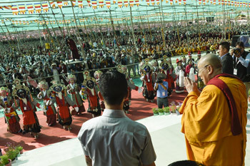 "Today, here in Leh," His Holiness began, "people of Ladakh, Tibetans and visitors from abroad are making prayers for my well-being. You are joined by many others who are not here, especially people in Tibet who have a special connection with me, many of whom are not allowed to express their faith and support; I greet all of you. In Mongolia, Russia and Taiwan, and even quietly in mainland China, I believe celebrations are taking place; I thank everyone taking part.