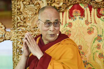 His Holiness the Dalai Lama speaking during the first day of preliminary teachings of the 33rd Kalachakra Empowerment in Leh, Ladakh, J&K, India on July 6, 2014. Photo/Manuel Bauer