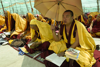 Members of the audience, some with umbrellas to protect agains the sun, listening to the the first day of His Holiness the Dalai Lama's preliminary teachings of the 33rd Kalachakra Empowerment in Leh, Ladakh, J&K, India on July 6, 2014. Photo/Manuel Bauer
