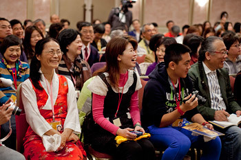 Audience members during the meeting with groups from Taiwan, Hong Kong, Macao and China, listening to His Holiness the Dalai Lama speaking in Tokyo, Japan on April 18, 2014.
