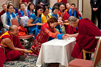 A member of a group from Mongolia presenting an offering to His Holiness the Dalai Lama during his last day in Tokyo, Japan on April 18, 2014. Photo/Office of Tibet, Japan