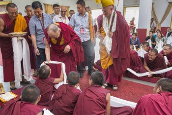 A young monk offering His Holiness the Dalai Lama a ceremonial scarf on his arrival at Rato Monastery in Mundgod, Karnataka, India on December 29, 2014. Photo/Tenzin Choejor/OHHDL