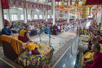 Mundgod, Karnataka, India, 19 December 2014 - The Drepung Lachi temple and courtyard were abuzz with anticipation this morning as His Holiness the Dalai Lama arrived to give a Palden Lhamo permission. He said the main disciples were the monks of Ganden Jangtse and Drepung, who had made the request.