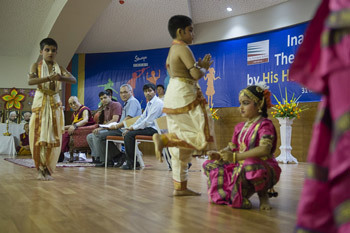 Mumbai, Maharashtra, India, 31 May 2014 - His Holiness the Dalai Lama’s first appointment this morning before resuming his teaching, was to inaugurate the Somaiya School in another part of the Somaiya Campus. He was greeted by a troupe of children dancing exuberantly to the insistent beat of a drum. He unveiled a plaque at the door and was ushered inside. In the school auditorium, before a gathering of children, parents and teachers, children recited the campus prayer in Sanskrit and another group performed a South Indian dance.