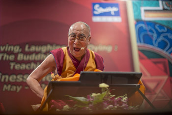 His Holiness the Dalai Lama enjoying a moment of laughter during the second day of his four day teaching at Somaiya Vidyavihar campus in Mumbai, India on May 31, 2014. Photo/Tenzin Choejor/OHHDL