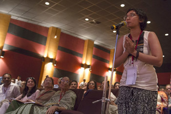 A member of the audience asking His Holiness the Dalai Lama a question during the second day of the four day teaching at Somaiya Vidyavihar campus in Mumbai, India on May 31, 2014. Photo/Tenzin Choejor/OHHDL