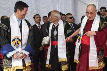 His Holiness the Dalai Lama is presented with an Honorary Doctorate of Philosophy from Martin Luther Christian University in Shillong, Meghalaya, India on February 3, 2014. Photo/Tenzin Choejor/OHHDL