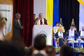 His Holiness the Dalai Lama delivering the Convocation Address at Martin Luther Christian University in Shillong, Meghalaya, India on February 3, 2014. Photo/Tenzin Choejor/OHHDL