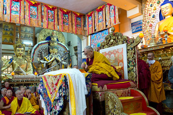 | His Holiness the Dalai Lama teaching at Theckchen Chöling Tsuglagkhang in Dharamsala, India on March 31, 2014. Photo/Lobsang Tsering/OHHDL |