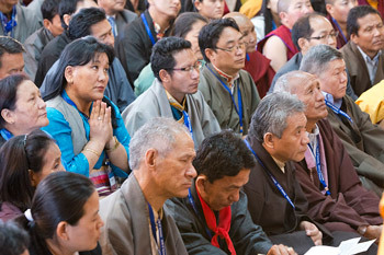 | Members of the audience listening to His Holiness the Dalai Lama at Theckchen Chöling Tsuglagkhang in Dharamsala, India on March 31, 2014. Photo/Lobsang Tsering/OHHDL |