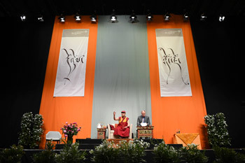 His Holiness the Dalai Lama speaking on "Compassion and Self Awareness" at Fraport Arena in Frankfurt, Germany on May 14, 2014. Photo/Manuel Bauer
