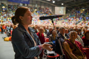 An audience member asking His Holiness the Dalai Lama a question during his talk at Fraport Arena in Frankfurt, Germany on May 14, 2014. Photo/Manuel Bauer
