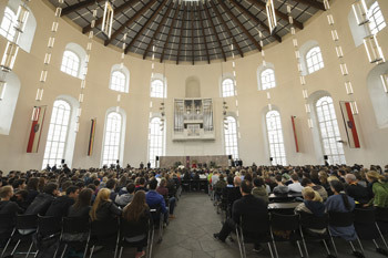 The two remaining events His Holiness attended at the behest of Tibet House Germany took place in St Paul's Church - Paulskirche, a building of symbolic significance. It was started as a Lutheran church in 1789. By 1849, it had become the seat of the Frankfurt Parliament, the first publicly and freely-elected German legislative body. In 1944, during World War II, the church was destroyed. As a tribute to its symbolism of freedom and as the cradle of Germany, it was the first structure in Frankfurt the city rebuilt after the war. In this oval-shaped church building His Holiness met young students in the morning and a bishop and philosopher in the afternoon with whom he discussed secular ethics.