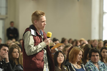 A student asking His Holiness the Dalai Lama a question during their discussion at the Paulskirche (St John's Church) in Frankfurt, Germany on May 15, 2014. Photo/Manuel Bauer