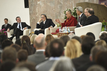 His Holiness the Dalai Lama speaking during the panel discussion on "Ethics Beyond Religion" in Frankfurt, Germany on May 15, 2014. Photo/Manuel Bauer