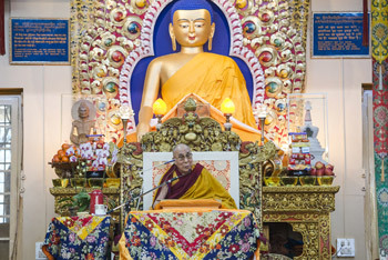 | His Holiness the Dalai Lama speaking during the first day of his four day teaching at the Theckchen Chöling Tsuglagkhang in Dharamsala, HP, India on December 2, 2014. Photo/Tenzin Choejor/OHHDL |