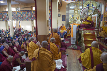 Dharamsala, Himachal Pradesh, India, 2 December 2014 - An audience of about 4000, including Tibetans, visitors from 49 countries and almost 600 Mongolians awaited His Holiness the Dalai Lama at the Theckchen Chöling Tsuglagkhang this morning at the start of four days of teachings. Among the Lamas and dignitaries sitting around the throne were the Ganden Tri Rinpoche and the Jangtse Chöjey.