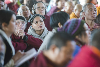 Some of the over 4000 people from 49 countries attending the first day of His Holiness the Dalai Lama's four day teaching at the Theckchen Chöling Tsuglagkhang in Dharamsala, HP, India on December 2, 2014. Photo/Tenzin Choejor/OHHDL