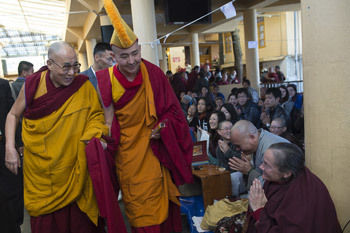 His Holiness the Dalai Lama greeting members of the audience as at the conclusion of the first day of his four day teaching at the Theckchen Chöling Tsuglagkhang in Dharamsala, HP, India on December 2, 2014. Photo/Tenzin Choejor/OHHDL