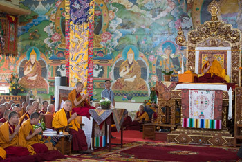 His Holiness the Dalai Lama taking part in the opening prayers on the ninth day of his teachings at Sera Jey Monastery in Bylakuppe, Karnataka, January 2, 2014. Photo/Tenzin Choejor/OHHDL
