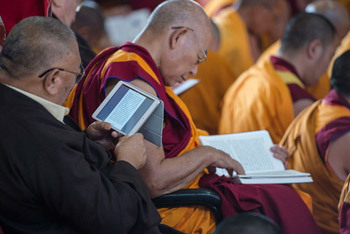 Members of the audience following the texts during His Holiness the Dalai Lama's ninth day of his teachings at Sera Jey Monastery in Bylakuppe, Karnataka, January 2, 2014. Photo/Tenzin Choejor/OHHDL