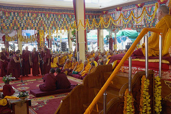 For auspicious reasons, after completing the ‘Essence of Nectar’ His Holiness made a start on reading ‘Zhamar Pandita’s Treatise on the Stages of the Path to Enlightenment’, but he said: