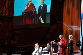 His Holiness spoke of the beneficial findings scientists have recorded when people engage in simple training exercises in compassion even for as little as three weeks. Their stress levels and blood pressure decrease, while their ability to get on with the people around them improves. He also pointed out that of the several thousand smart people in the audience, those who were raised with affection are probably happier now than those who were not. Similarly, when there is affection between members of a family, whether they are well-off or not, they will be happier, whereas members of families who may be wealthy, but are beset by a deep sense of jealousy and mistrust tend to be unhappy. This, His Holiness said, is common sense. He told the story of the Catholic monk he met in Barcelona who had been in retreat in the mountains for 5 years meditating on love. He survived mostly on bread and water and yet his sparkling eyes revealed him to be full of joy, a living example that inner values are the key to real happiness.