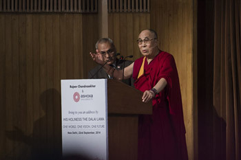 New Delhi, India, 22 September 2014 - This morning, His Holiness the Dalai Lama was invited to speak at the Indian Habitat Centre by Rajeev Chandrasekhar MP and the Ashoka University. Mr Chandrasekhar is an independent member of the Rajya Sabha, the upper house of the Indian Parliament, representing Karnataka and Bangalore. The Ashoka University is a fully residential university whose founders believe that education should be holistic and liberal. In his introduction Mr Chandrasekhar praised His Holiness as someone who espouses peace and co-existence.