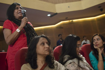 A member of the audience asking His Holiness the Dalai Lama a question during his talk at the Indian Habitat Centre in New Delhi, India on September 22, 2014. Photo/Tenzin Choejor/OHHDL