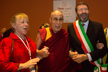 Rome, Italy, 12 December 2014 - When His Holiness the Dalai Lama arrived early at the venue of the 14th World Summit of Nobel Peace Laureates, the Auditorium Parco della Musica, this morning, he found that many of his fellow laureates were yet to come. He met first with the Mayor of Rome, Ignazio Marino, and then greeted old friends like Jody Williams, Shirin Ebadi and Mairead Maguire and new friends like Leymah Gbowee and Tawakkol Karman as they arrived.